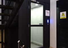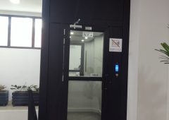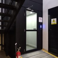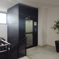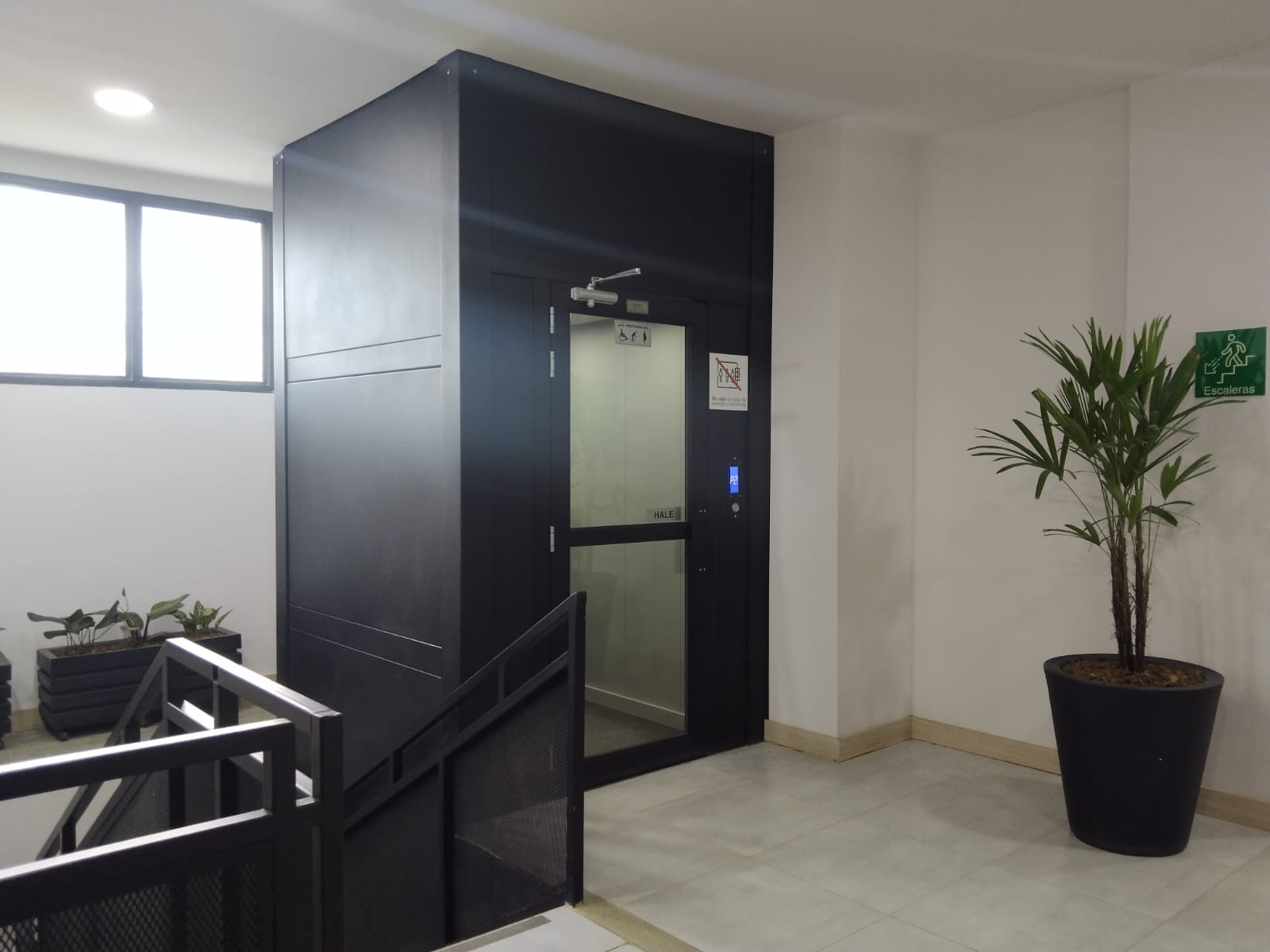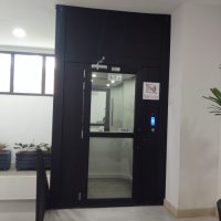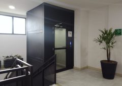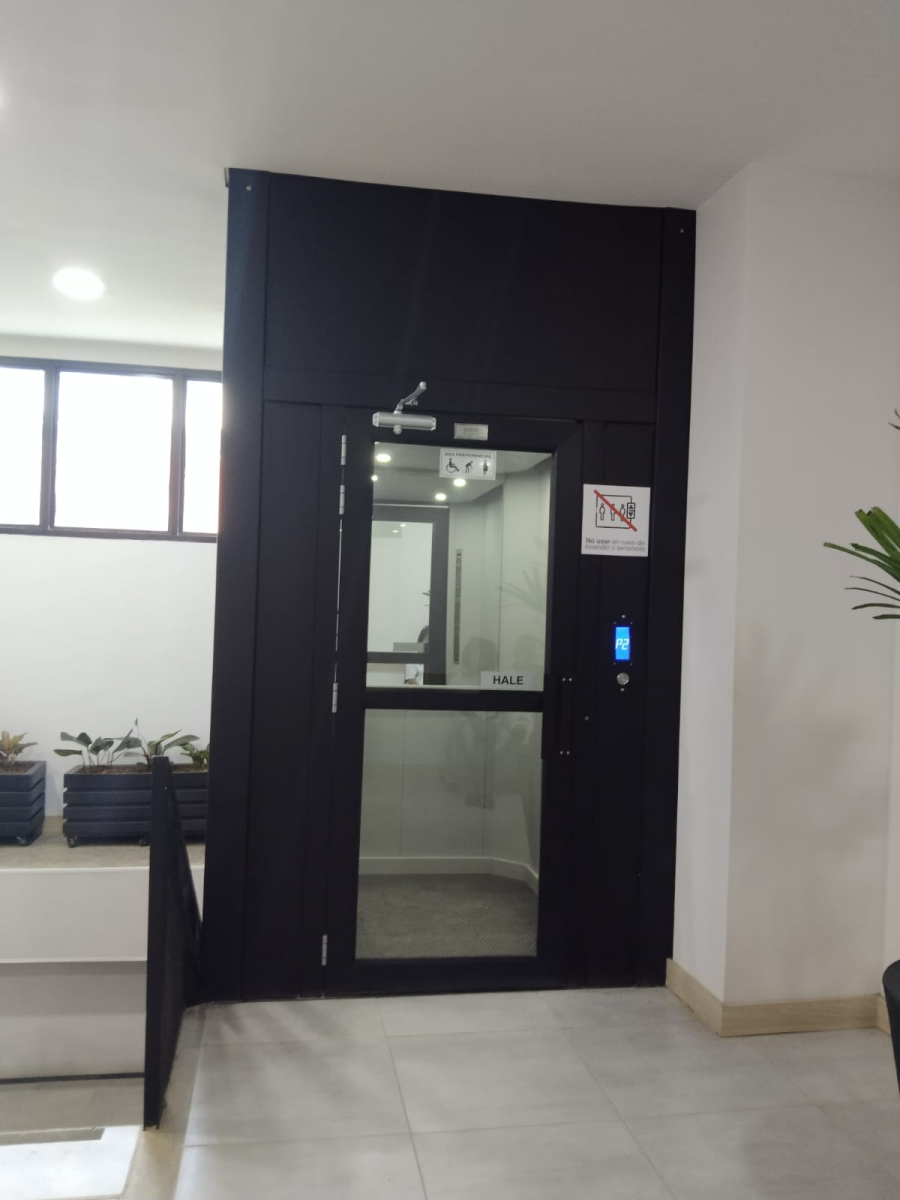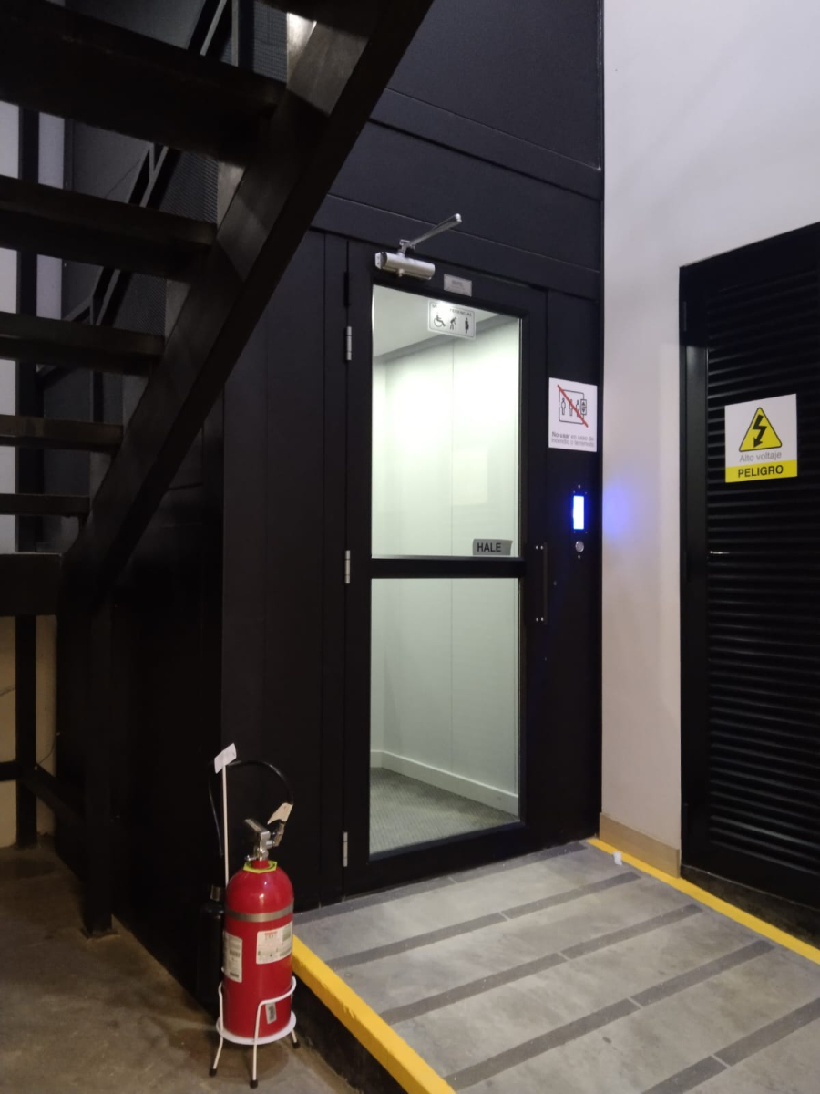 Plataforma elevadora vertical (PEV) hidráulica de dos paradas con cerramiento, puertas batientes semiautomáticas de uso institucional.