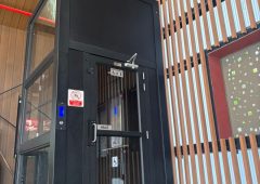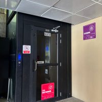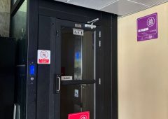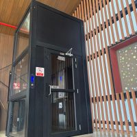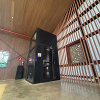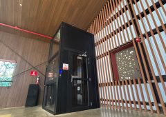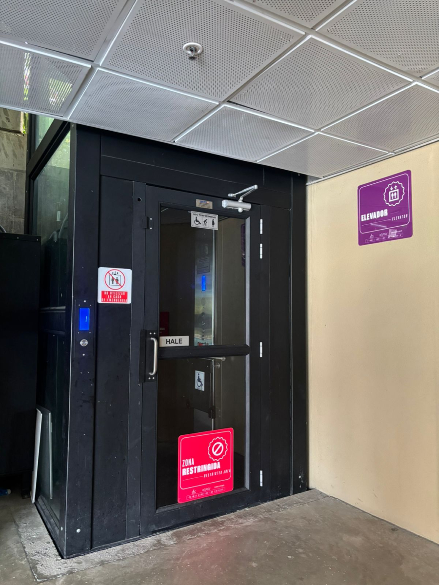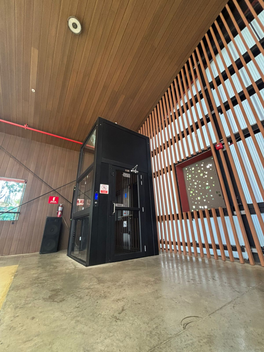 Plataforma elevadora vertical (PEV) hidráulica de tres paradas con cerramiento panorámico, puertas batientes semiautomáticas y cabina panorámica de uso institucional.
