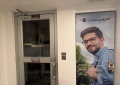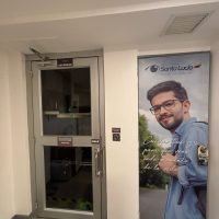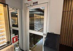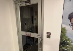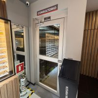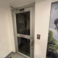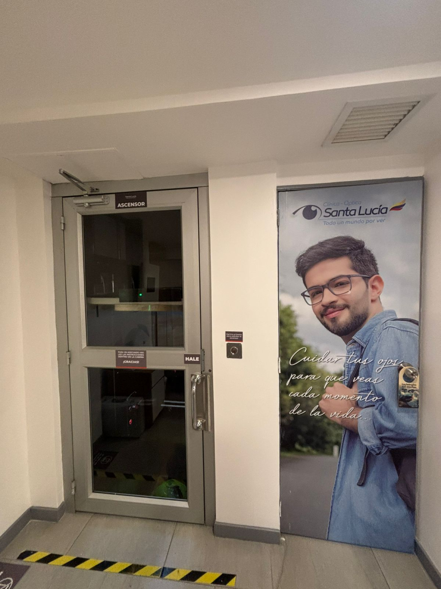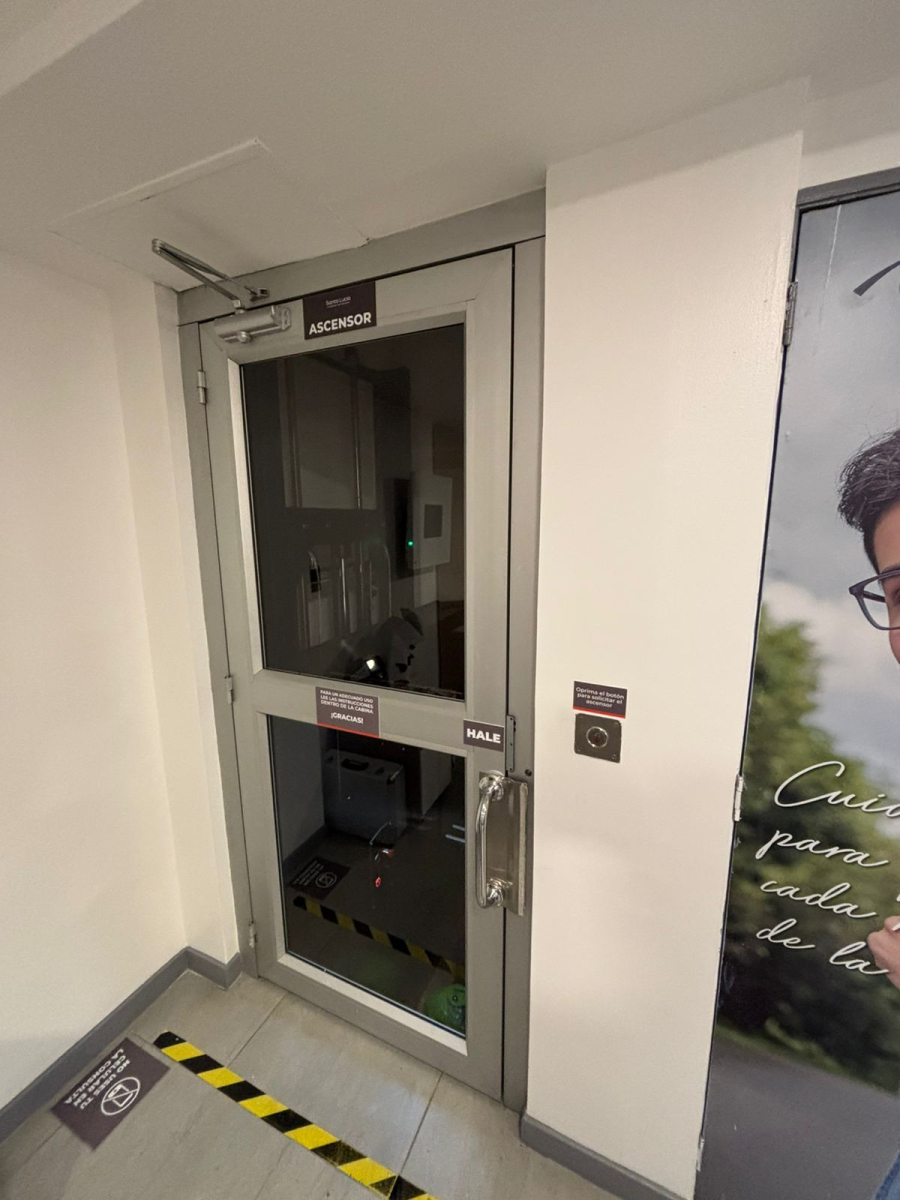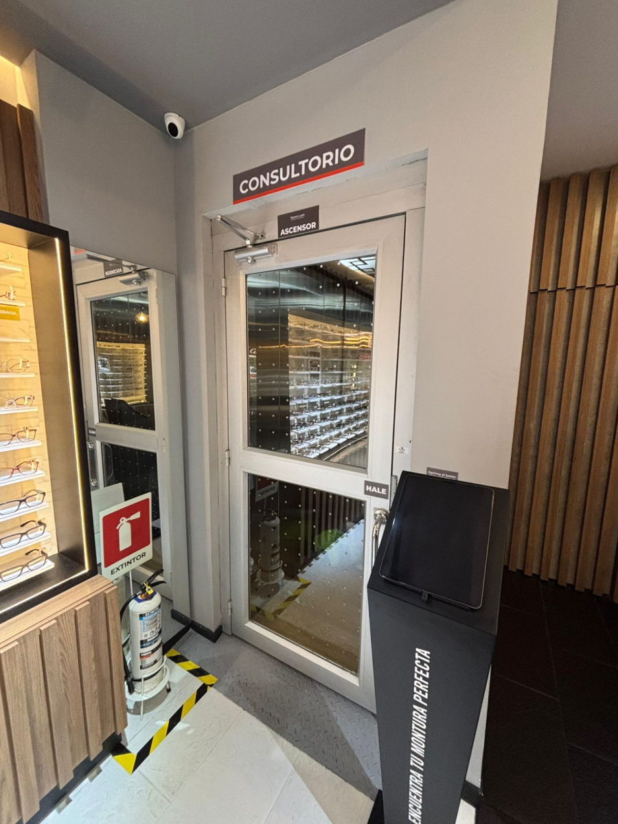 Plataforma elevadora vertical (PEV) hidráulica de dos paradas con cerramiento, puertas batientes semiautomáticas y cabina panorámica de uso empresarial.